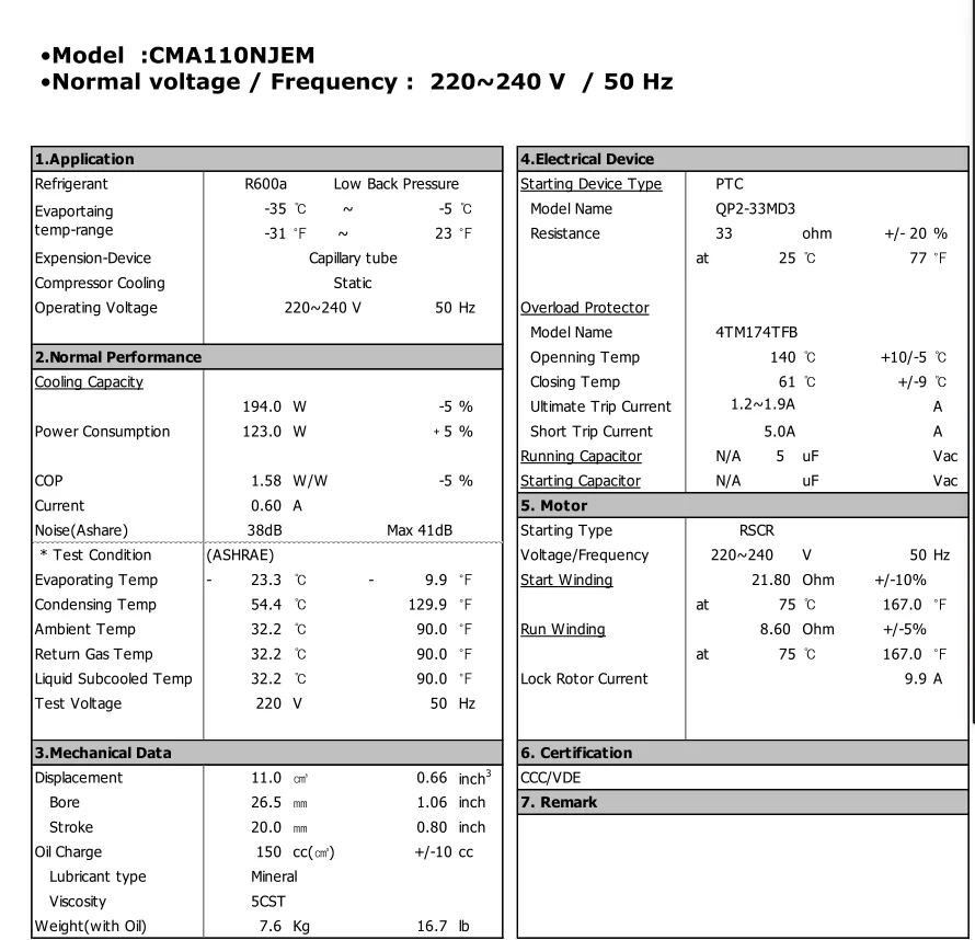 | CMA110NJEM | R600a | LBP | 220V/50HZ | 1/4HP | 194W | 122W | 1.58 | Al-wire |