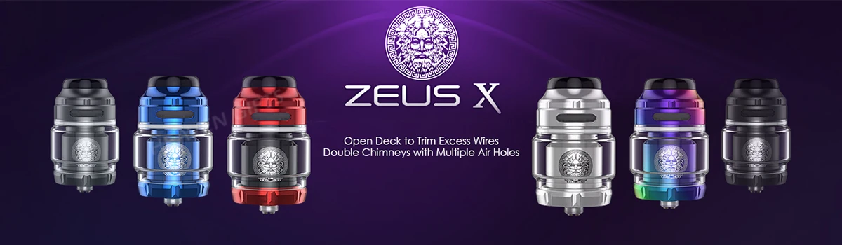 Inherited from GeekVape Zeus Atomizers family, the GeekVape Zeus X RTA is a latest vape device for single/dual coil building. The Zeus X RTA comes with two capacity, 4.5ml and 2ml, to meet your needs for different liquid storage. The postless build deck provides an easy way for single/dual coil building too. The GeekVape Zeus X RTA adopts innovative double chimney design. And the multiple holes on the inner chimney brings smooth air inlet to the coil. The improved top airflow design also prevents leakage.