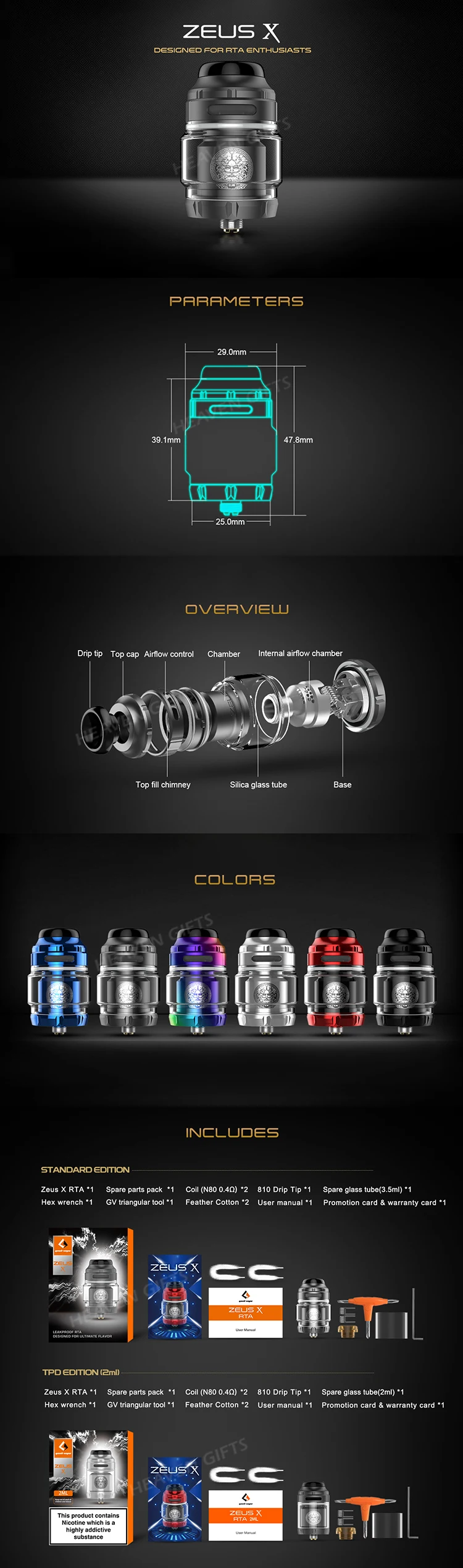 | Type: | Standard Edition, TPD Edition; | Packaging Detail: | GeekVape Zeus X RTA 2ml/4.5ml Original Gift Box.; |
