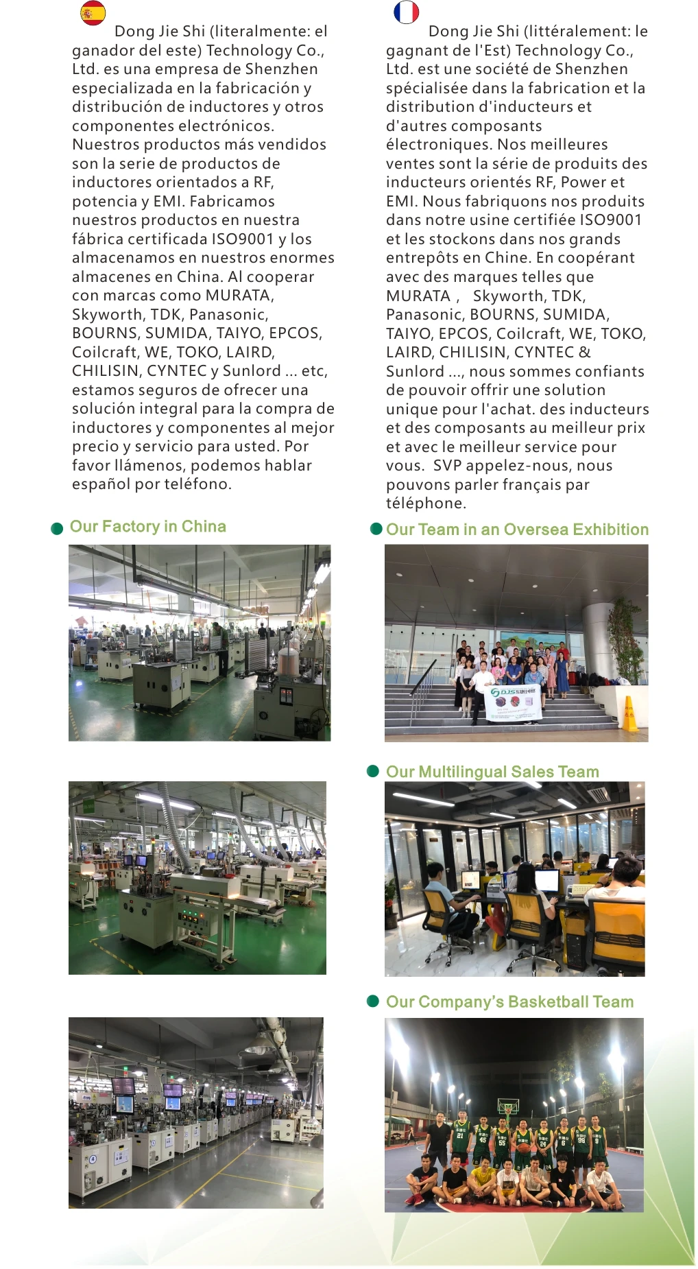 Dong Jie Shi ( literally: Eastern Winner) Technology Co., Ltd. is a company from Shenzhen specialized in the manufacturing and distribution of Inductors and other electronic components. Our bestsellers are the product series of RF, Power and EMI oriented inductors. We manufacture our products in our ISO9001 certified factory and stock them in our huge warehouses across China. By cooperating with brands like MURATA,Skyworth, TDK, Panasonic, BOURNS, SUMIDA, TAIYO,EPCOS,Coilcraft, WE, TOKO, LAIRD, CHILISIN, CYNTEC &Sunlord...etc, We are confident to offer a one stop solution for the purchase of inductors and components at the best price and service for you.