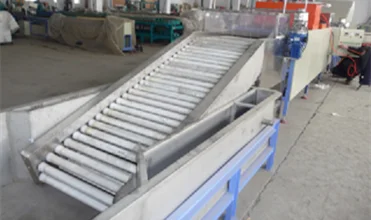 d. After washing in the stainless steel water tank, the fruits will be elevated to the straight selection platform, and the plastic roll will move forward and rotate, which will make it easier for the inferior fruits to be selected out. (Fruit elevator: 2900 * 900 * 1150mm)