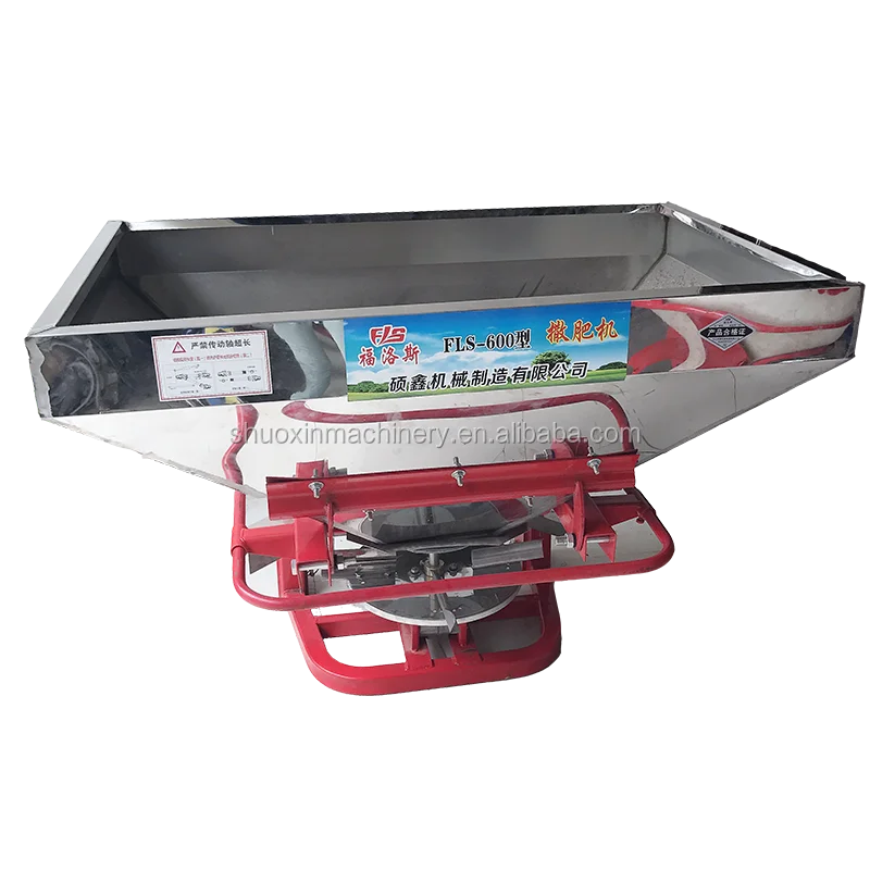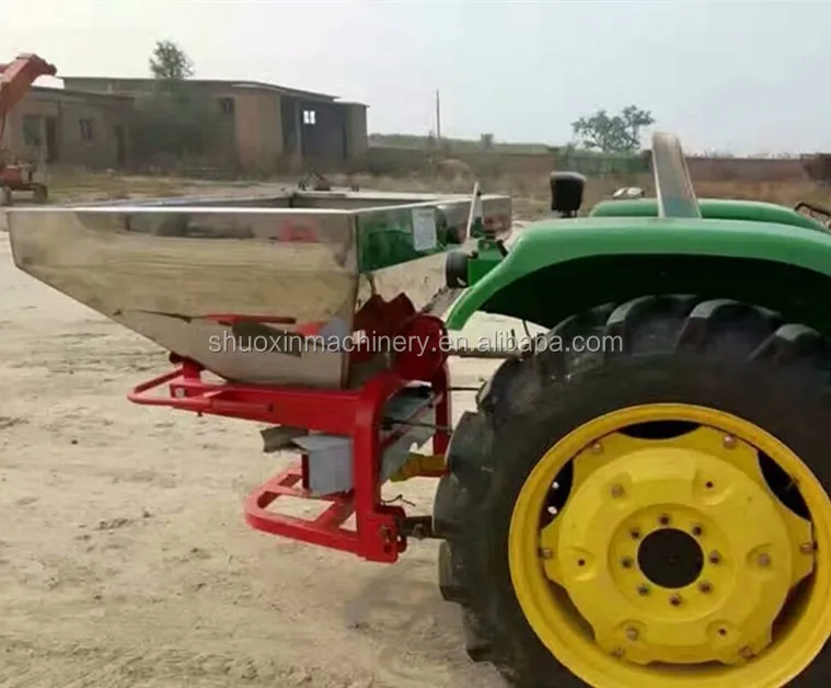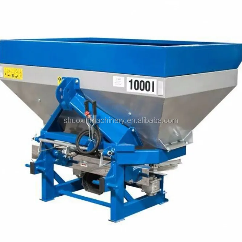 Fertilizer spreaders mounted to the Tractors through three point linkage system. It is powered by throughout a rod by tractor PTO and linked up by spreader discs and smashers in the tank.