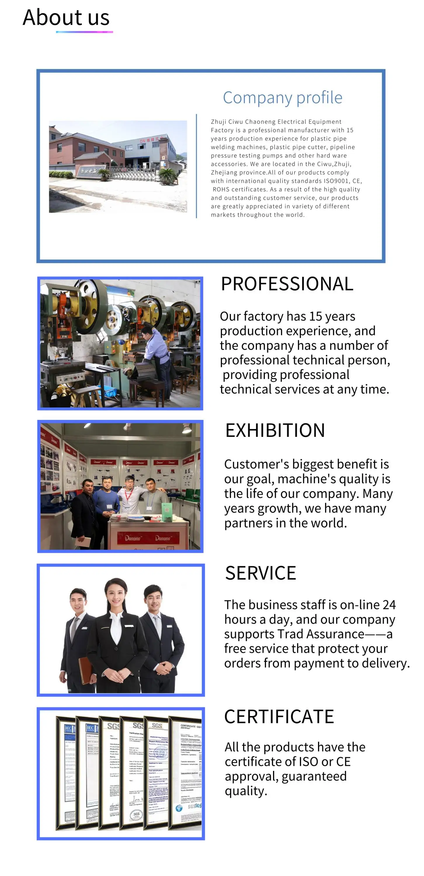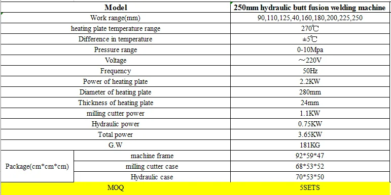 | Welding range: | 90mm-110mm-125mm-140mm-160mm-180mm-200mm-225mm-250mm; | Power: | 3.3KW; |