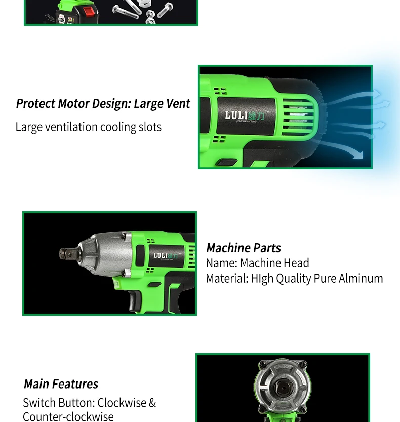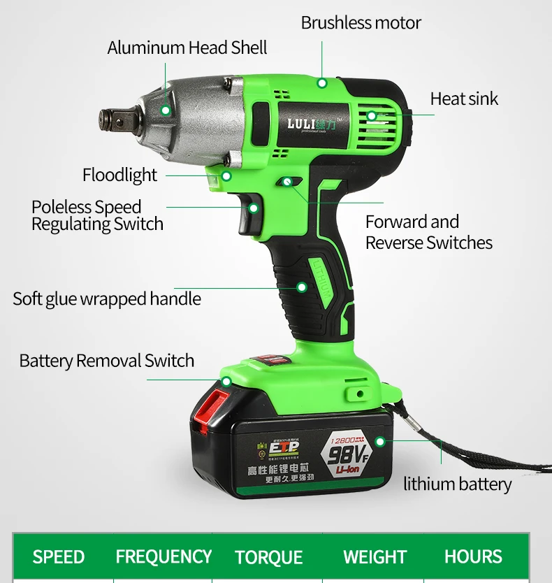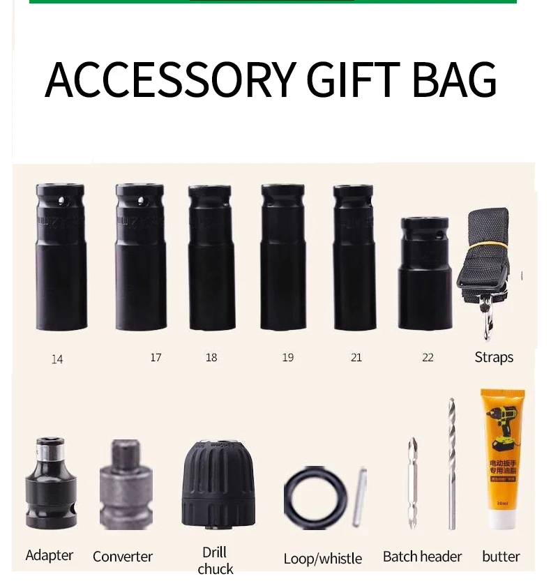| Dimensions: | 10*8*23; | Name: | 20V Li-ion battery Brushless Cordless Electric Impact Wrench; |