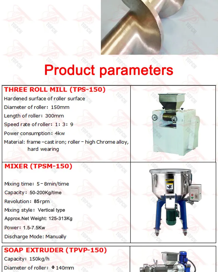 The capacity is 150kg/h. It can produce the toilet soap and laundry soap. The main equipment are including mixer, mill, plodder and stamping machine. The advantage for this production line is small investment, simple equipment and convenient operation.