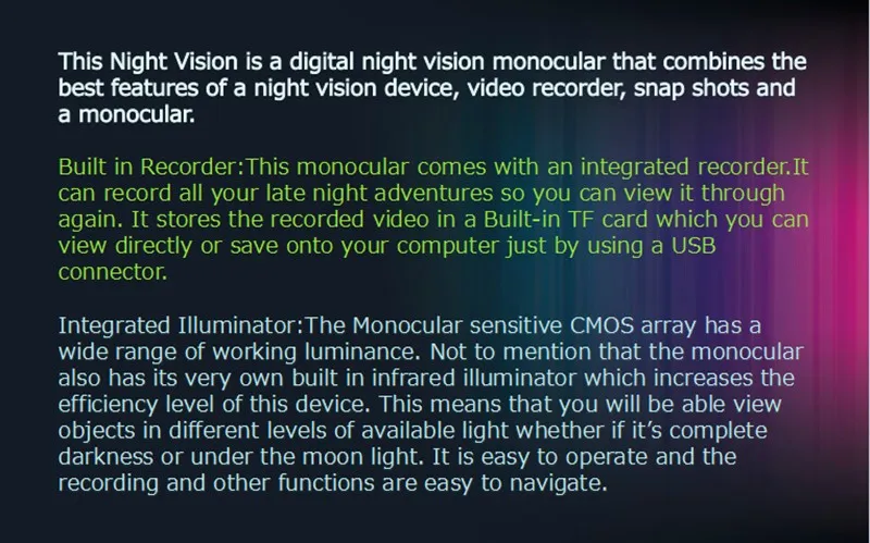 It can be used for observation in complete darkness or low light conditions. The monocular can be used to take photos or capture video during the day or at night. It features a fixed 5x optical zoom and up to 8x digital zoom.