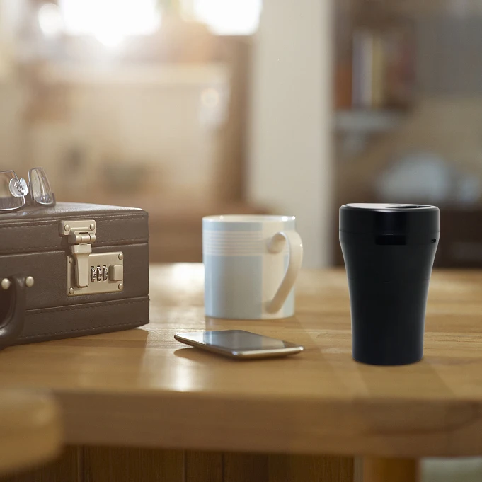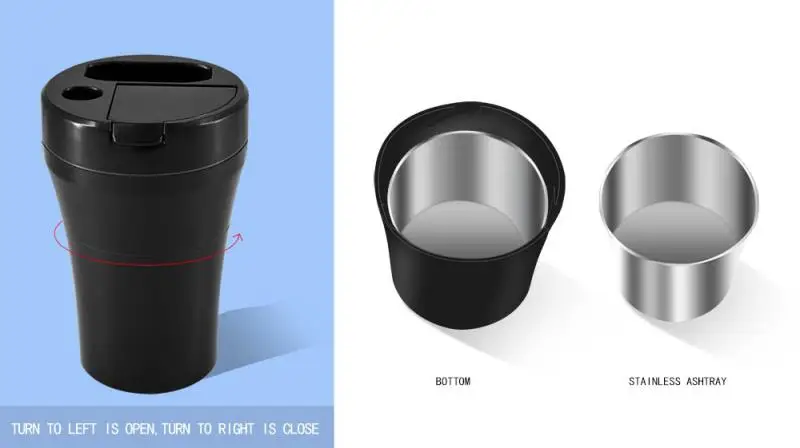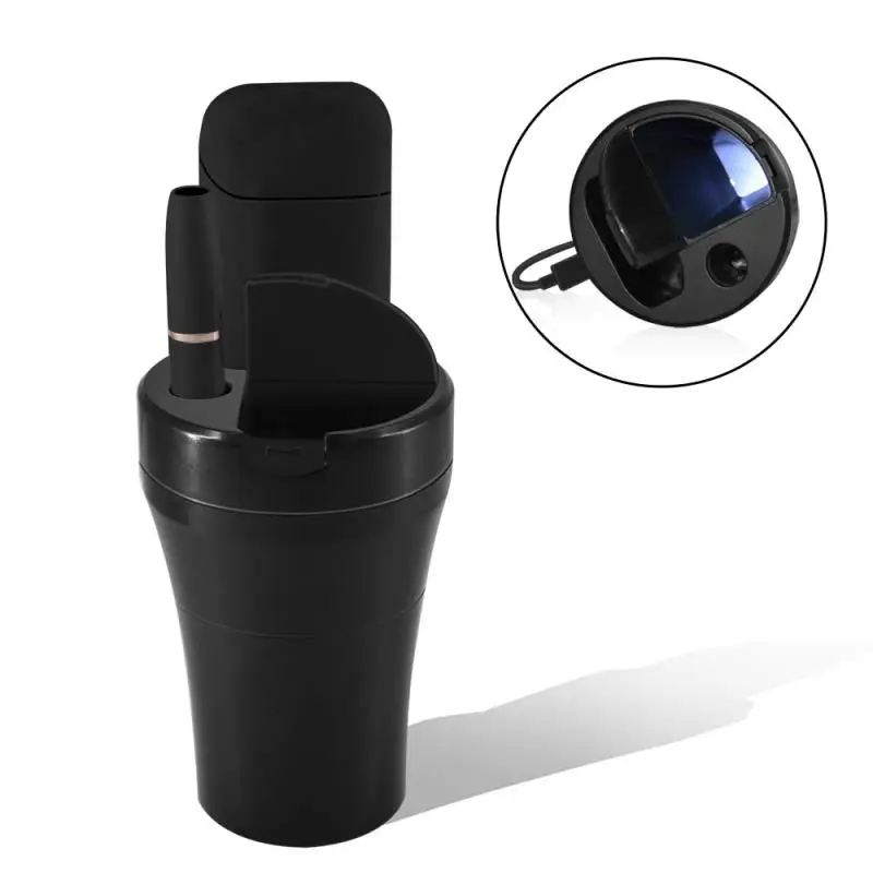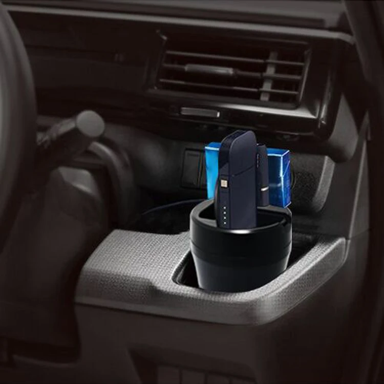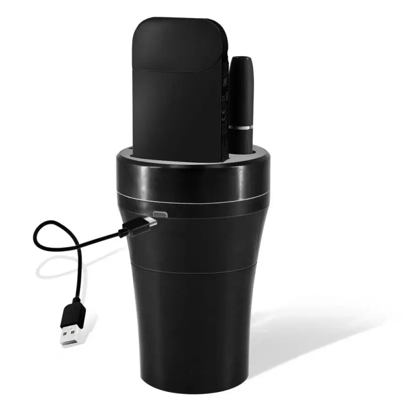 Cup design fits the car cup hole. When upper and lower sections are unscrewed, it can be used separately. It is an ashtray and a charger also at the same time.