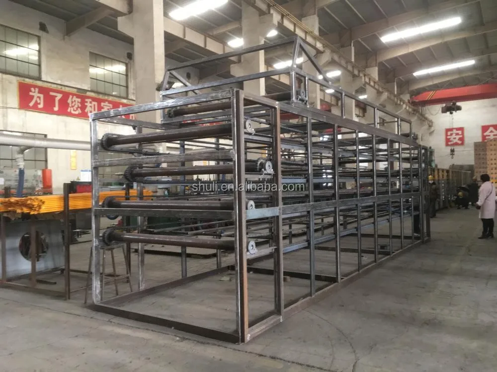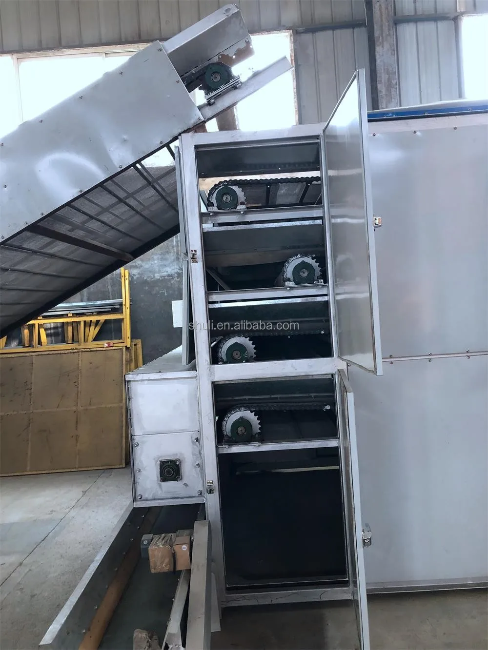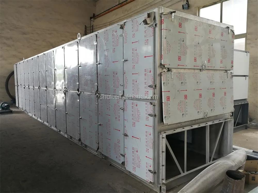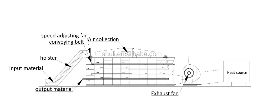 The multi-layer dryer is a batch and continuous production drying equipment. The main heating methods are electric heating, steam heating, hot air furnace heating and gas heating. The main principle is to evenly spread the material on the mesh belt. The mesh belt adopts a 12-60 mesh steel mesh belt, which is dragged and moved in the dryer by the transmission device. The hot air flows through the material, and the water vapor flows from The drainage hole is discharged to achieve the purpose of drying, and the length of the box body is composed of standard sections. In order to save the space, the dryer can be made into a multi-layer type, and the common ones are two-room three-layer, two-bedroom five-layer, four The room has five floors, four rooms and seven floors, etc. The length is 6-40m, and the effective width is 0.6-3.0m.