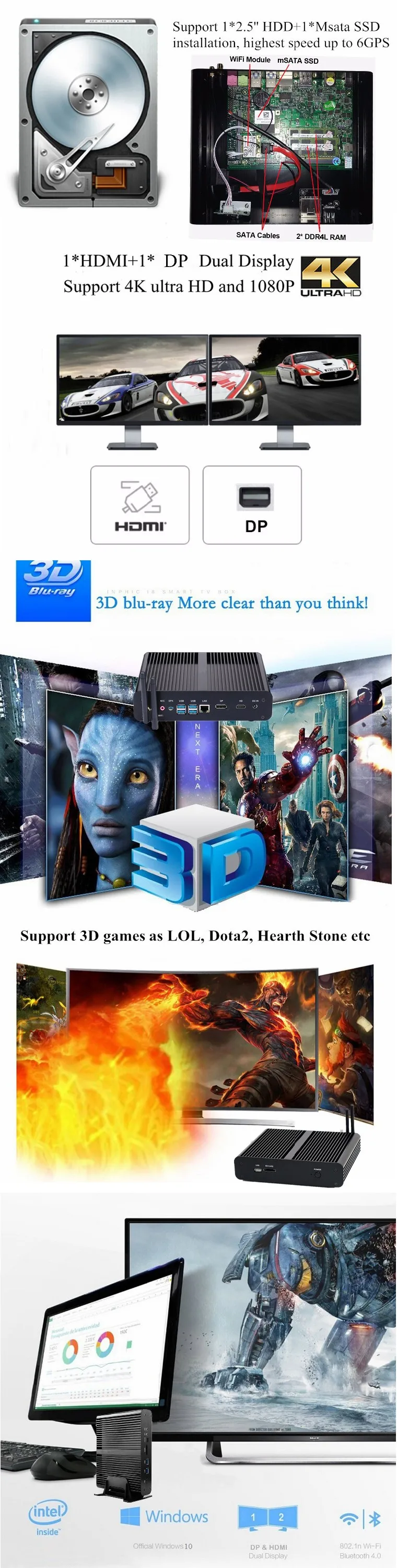 HD Output: 1* HDMI port, support 4k output; 1* DP port, support HDMI+DP dual display