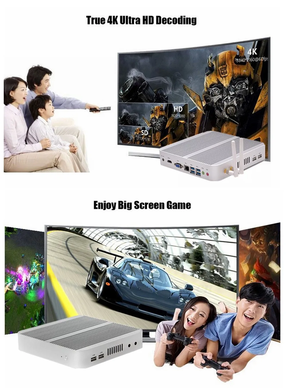 DDR4 RAM HTPC WIFI Bluetooth Fanless Mini PC Gaming Desktop Computer