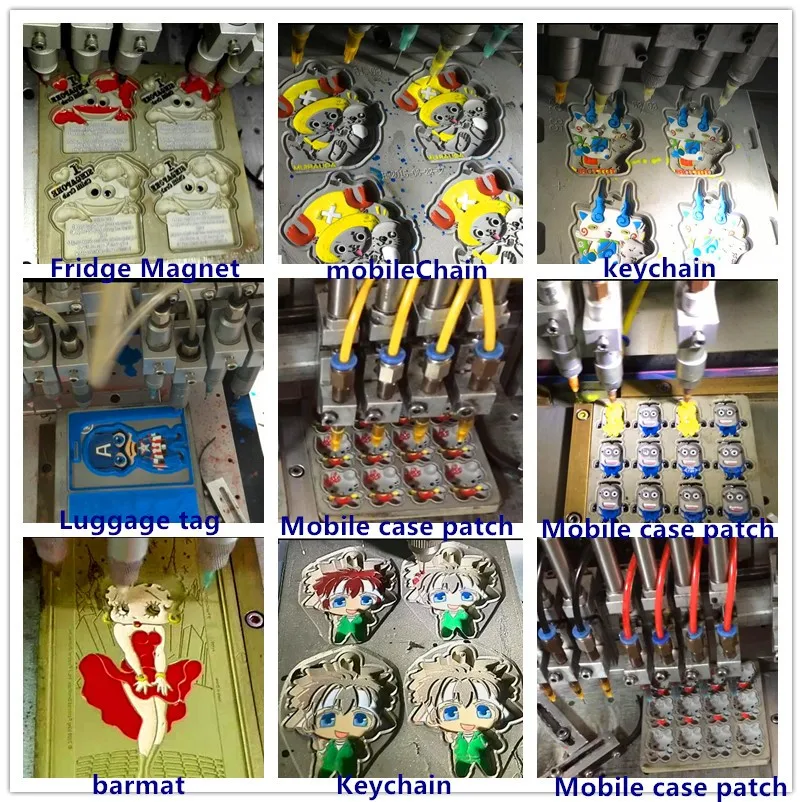 key chains, key caps,phone holders, cartoon USB drives, luggage tags, refrigerator magnets,photoframes, book marks ect.Our machine can be also produce plastic garment accessories such as PVClabels, silicone labels and zipper pullers .