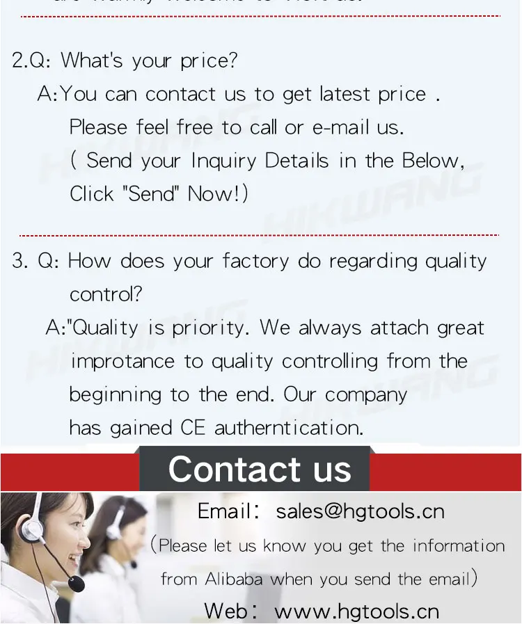 3. Q: How does your factory do regarding quality control? A:"Quality is priority. We always attach great improtance to quality controlling from the very beginning to the very end. Our company has gained CE autherntication. |