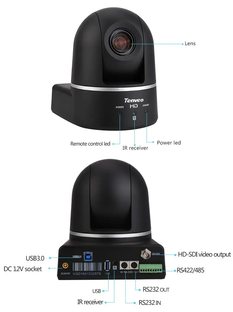 A:There are RS232, RS485 PTZ Control, and also support VISCA, PELCO-P, PELCO-D to control through your Codec or PC through RS232, and support IR remote control.