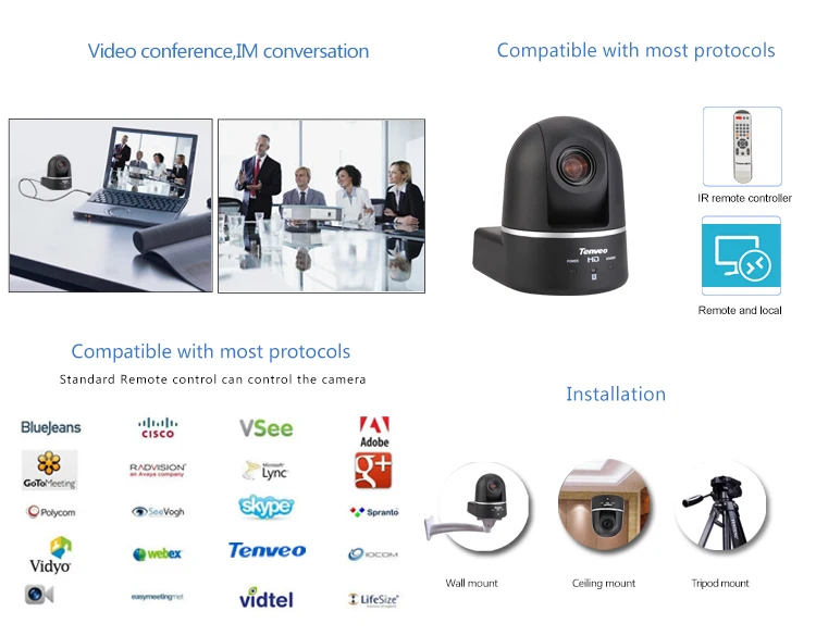 A:It’s compatible with PolyCom, Blue Jeans, Cisco, Vsee, GoToMeeting, Radvision, SeeVogh,WebEx, easy meeting, Vidtel and working with Microsoft Lync Software,and ZOOM.US, SKYPE, VIDYO Etc.