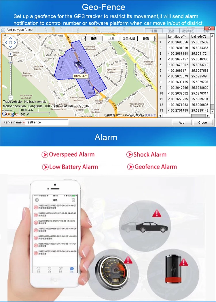 | Alarms: | Over speed/ Geo-fence/ Cut power/ ACC on/ Shock; | GPS sensitivity: | -162Db; |