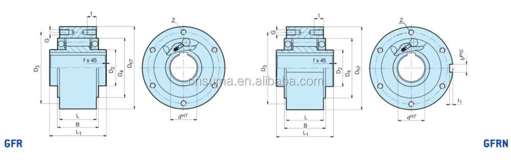 Typically, types GFR,GFRN are used with the F series covers that are designed to transmit torque, and provide oil lubrication and sealing. Usually these covers are used in pairs according to combinations shown on the following pages. The outer race of the GFR model is plain to receive and center any component bored to H7 tolerance.