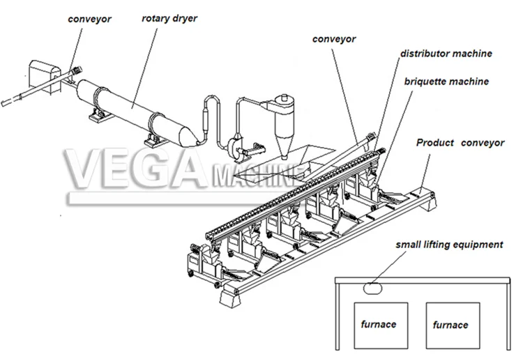 Crusher- Conveyor-Rorary Dryer-Conveyor-Distributor Machine-Briquette Machine-Product Conveyor-Small Lifting -Carbonization Furnace