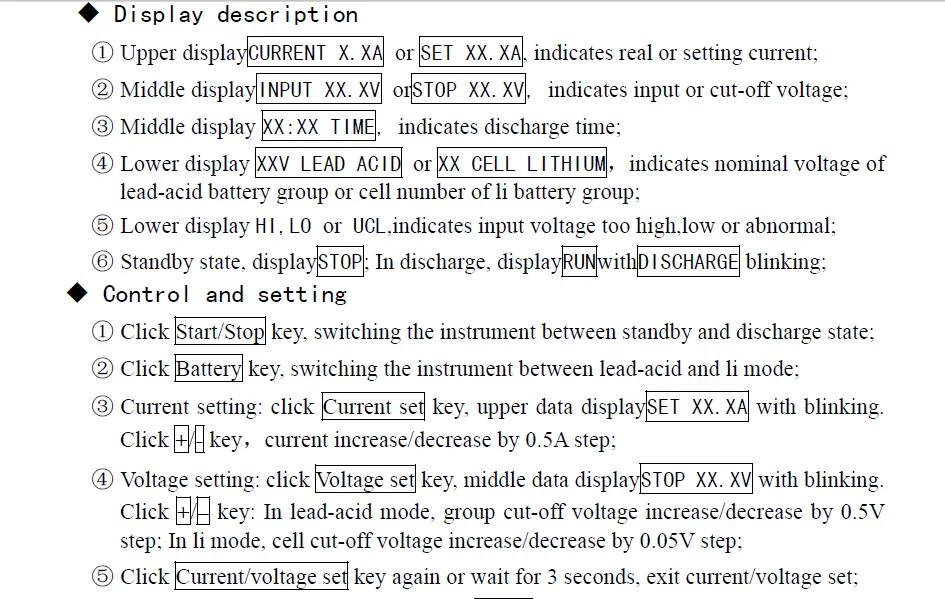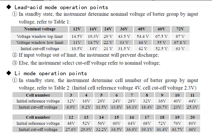 For this series of tester, we have three models: 48V10A, 48V20A and 72V20A. And for these models, the functions and operating methods are same; they have two kinds of operating mode: lead acid and lithium-ion batteries.The product is adaptive control; it can be used for 1s-6s 12V lead acid battery or 3s-20s lithium-ion battery pack to do discharge test.