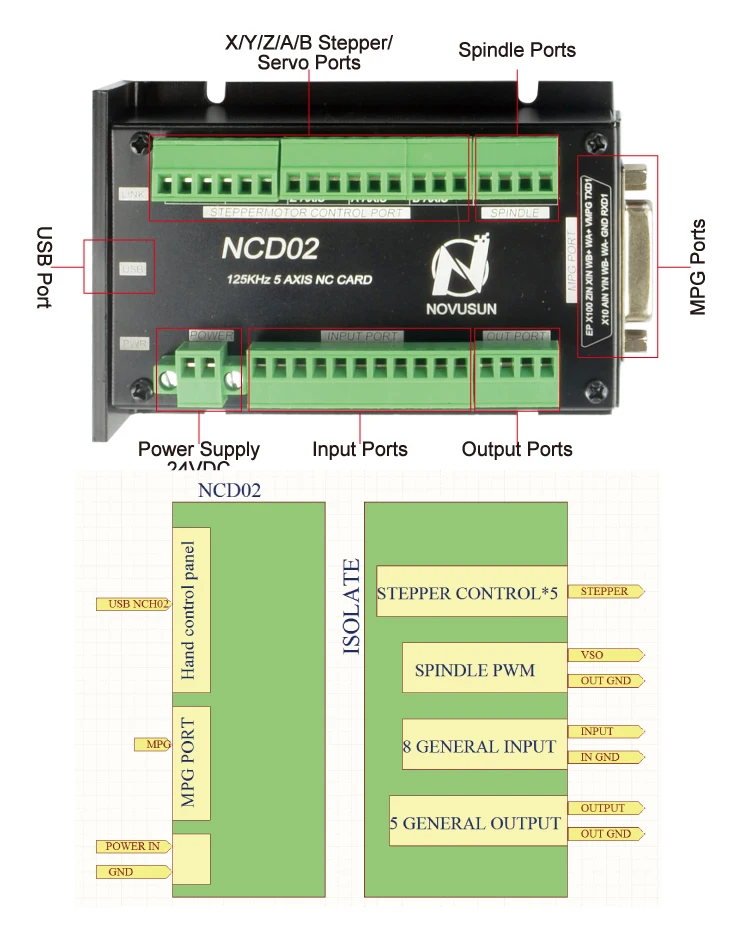 As the picture shows, the wiring section of the controller has Stepper/Servo Ports,Spindle Control Ports,MPG ports,Output and Input Ports,and Power supply Ports,as well as USB ports.