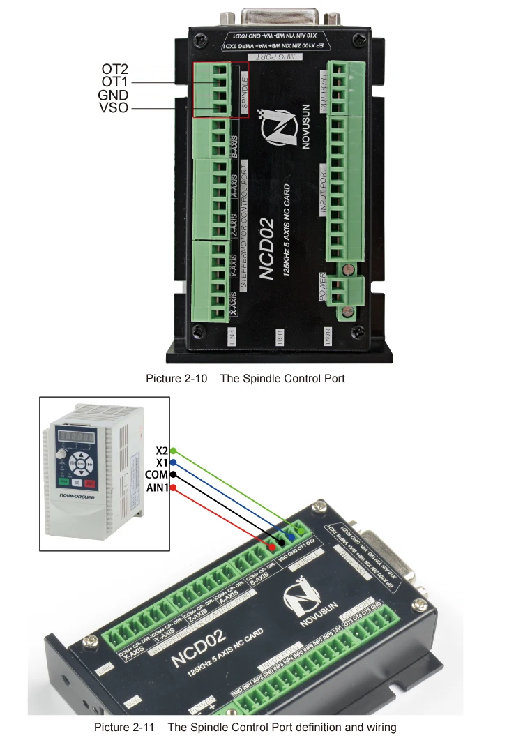 The VSO is the 0-10V analog output, OT1/OT2 digital signal output, spindle control output interface and spindle inverter connection methods as Picture 2-11. VSO/GND/OT1/OT2 are respectively connected with the inverter AIN1/COM/X1/X2, where AIN1 is the input speed signal;COM is Comman Ground;X1 and X2 are configured to forward and reverse Turning.
