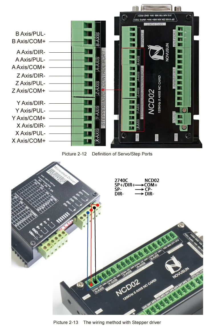 The following Picture 2-12 shows the definition of Servo/Stepper Ports.There are 5 axis X/Y/Z/A/B,each axis connection is common anode.Output signal voltage is 5V.