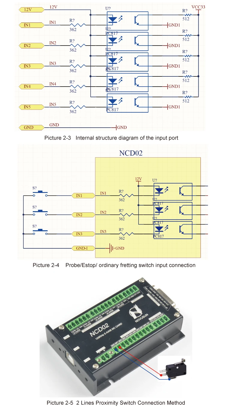 As the Picture 2-2 showed,Inputs ports has already defined.The Users can use them as E-stop,Probe,limited/Home functions and so on.The ports is a common negative interface,which can be connected with a micro switch,a 2 line proximity switch or a NPN type 3 line proximity switch.All the ports are isolated.And the internal structure is as following Picture 2-3.