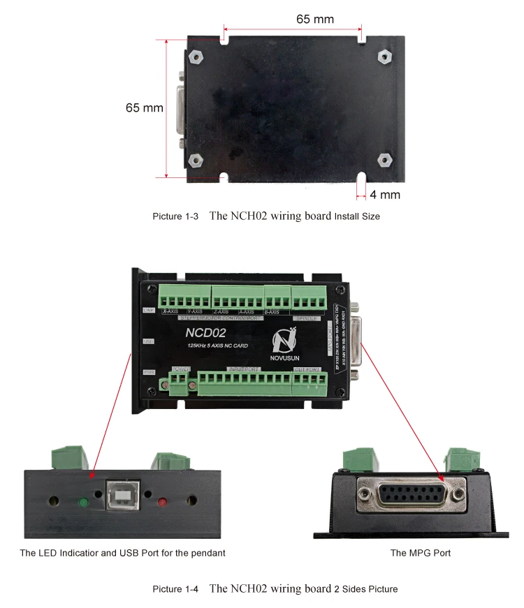 Picture 1-4 shows the 2 side pictures of NCH Wiring Board.The one side is for the MPG interface;and the other side is the LED indicators and USB port for the communication with the NCH02 Pendant Controller.