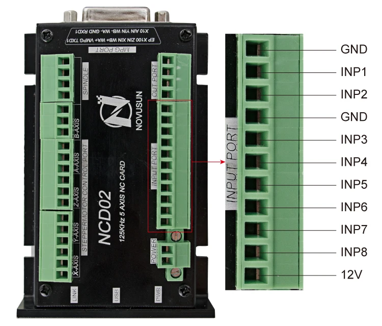 The circuit switching wiring board provides screw terminals for power (24VDC), input signals, spindle control, pulse and direction for X/Y/Z/A/B stepper/ servo drives, MPG, input and output ports as well as an USB input.