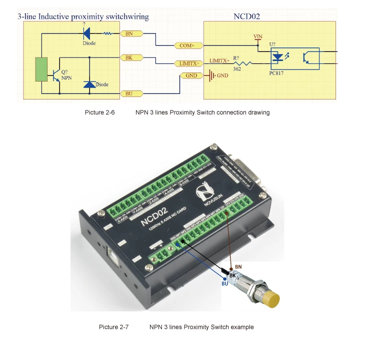 3 lines Proximity Switch connection method as following Picture 2-6 shows. Brown cable connect with 12V,Black cable connect channel, blue cable connect with GND1.