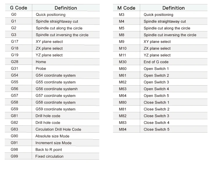 As the following G code list and M code list shows,these G codes and M codes are supported by NCH02 Motion Controller.