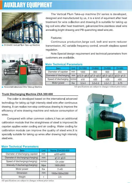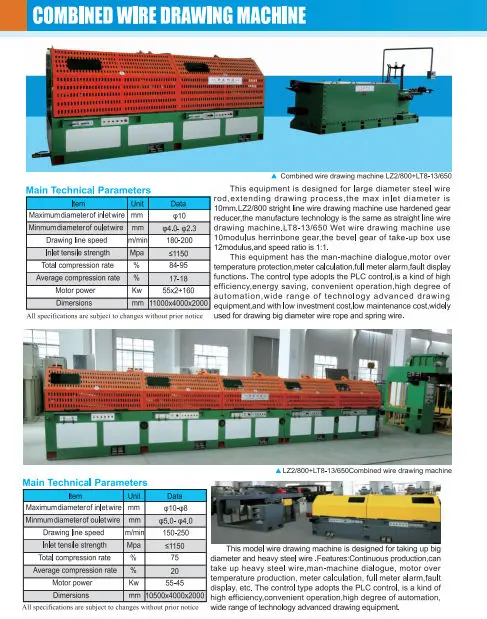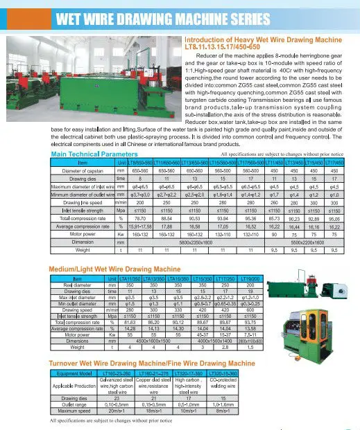 The equipment contains the function of human-machine dialogue,over-temperature protection for motor,alarm for abnormal water pressure,fault display,etc.Its transmission structure is hardened gear reducer+narrow V belt or planar double worm gear reducer+narrow V belt with low noise.The capstan applies the combination of narrow water cooling and air cooling with good cooling effect.AC variable-frequency and Siemens PLC is used for speed adjustment.Generally,it is a kind of efficient and advanced drawing machine equipment with easy operation,high degree of automation and broad process scope.