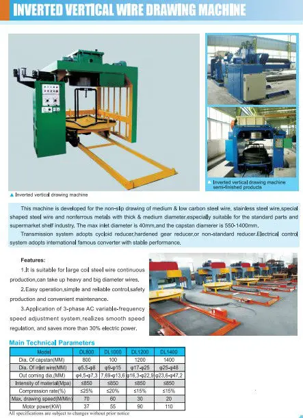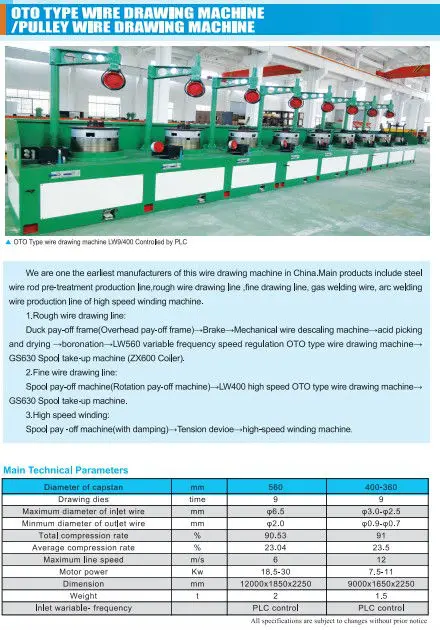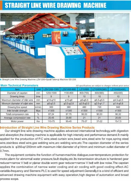 Our straight line wire drawing machine applies advanced international technology,with digestion and absorption,the drawing machine is applicable for high intensity and performance demand.It mainly applied for the production of P.C wire,steel curtain wire,bead wire,steel wire for rope,spring steel wire,stainless steel wire,gas welding wire,arc welding wire,etc.The capstan diameter of the series products is φ350-φ1200mm with maximum inlet diameter of φ14mm and minimum outlet diameter of 0.7mm.