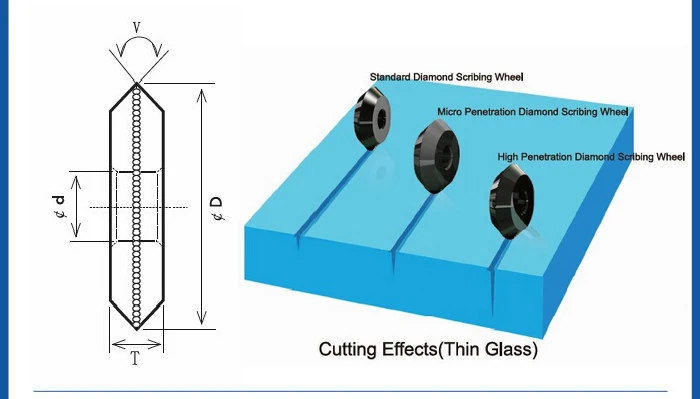 Better than the traditional scribing wheels without teeth, high-penetration diamond scribing wheels can make the touching area between scribing wheels and glass become smaller, strengthen the pressure to the glass, and deepen the penetration of wheels for the “vibration enhancing effects” during the scribing on the glass.