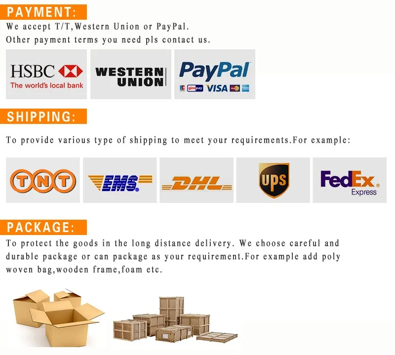 6.Easy and multiple payment:Bank transfer,T/T,Western Union,Paypal and so on.