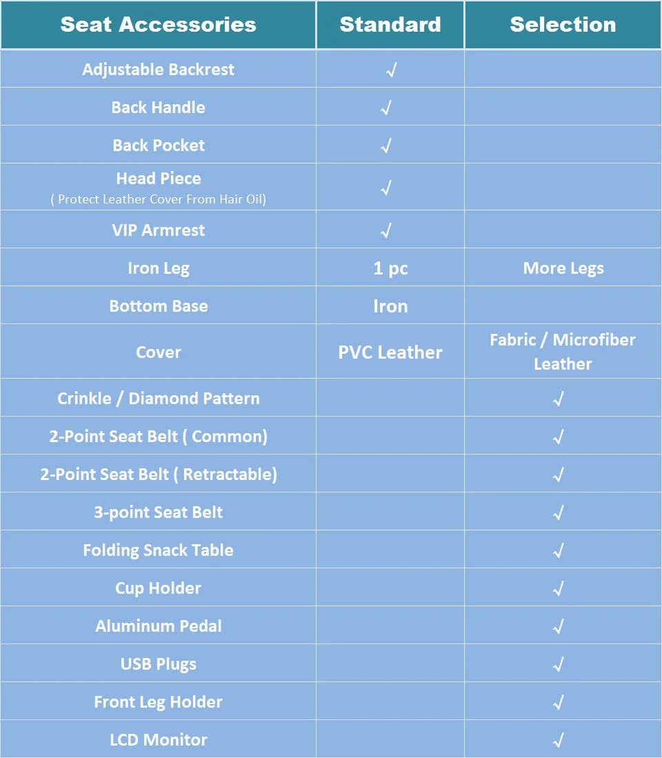 | Optional Accessories: | Seat belt, table, USB plug, pedal, front leg holder, TV screen, etc; | OEM No.: | None; |