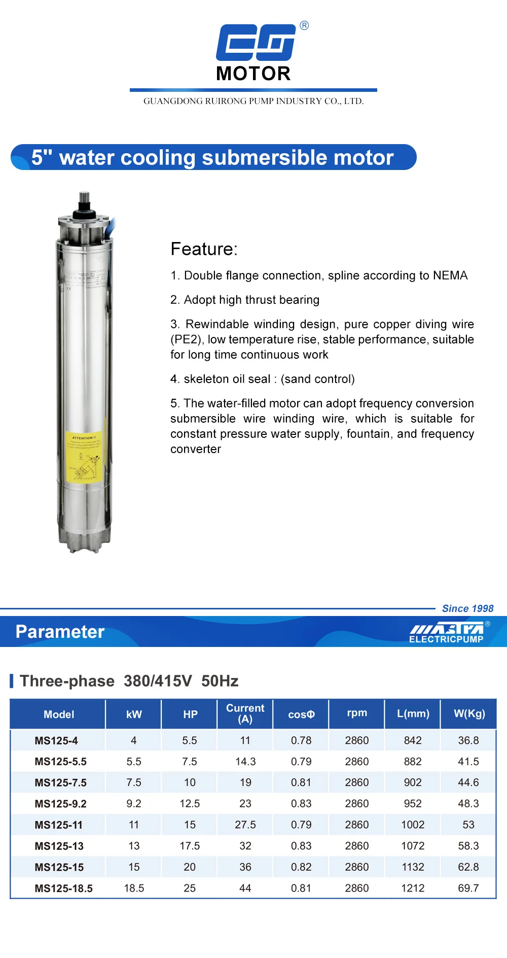 Mastra 5 inch 380V Water Cooling Submersible Motor 50Hz