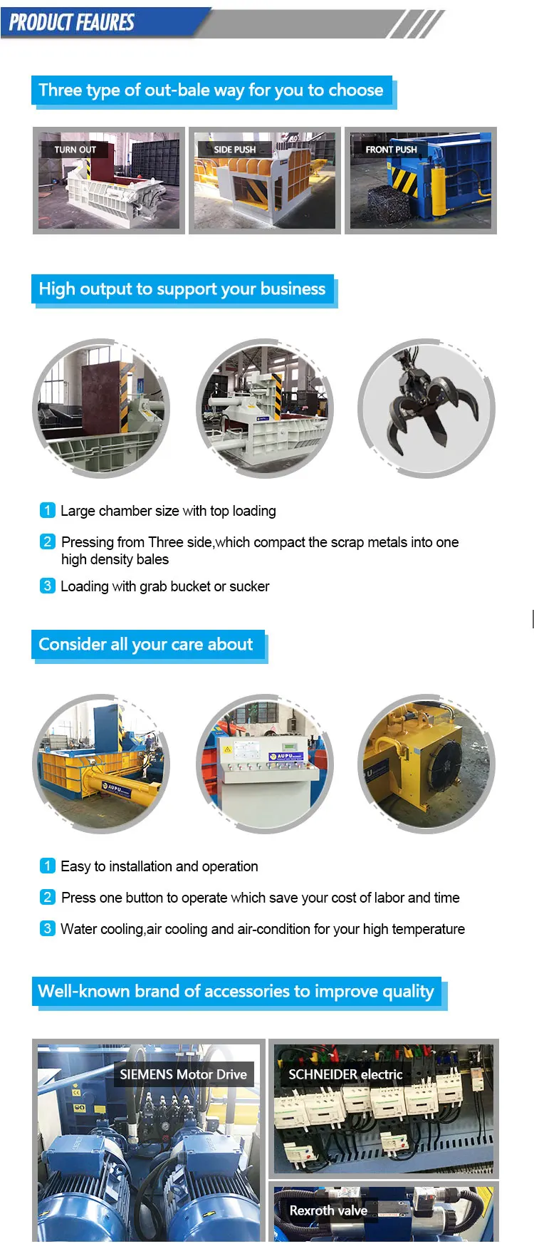 Y81 series metal scrap baler is capable of extruding various metal leftover,steel paring,waste copper,aluminum,stainless steel and scrapped car into regular charging as square, column,cylinder etc. different shapes. The costs of transportation and refining can be reduced. It also make the transportation easier and faster.