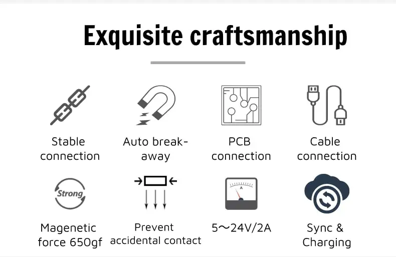 | Voltage rating: | 5-12V; | Type: | Magnetic pogo pin connector; |