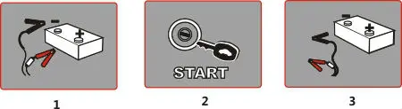 To start 12V vehicle, please make sure at least three LED lights of EPOWERare bright firstly, then connect the Red battery clamp to the battery Positive (+) and Black clamp to the battery Negative (-) and insert the plug into the EPOWER, finally turn the ignition switch to the START position. Once the vehicle is started, please disconnect the plug and remove the battery clamps within 30s.