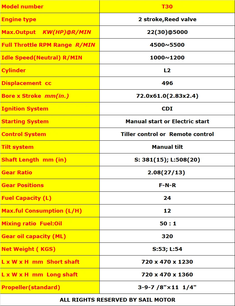 A: Yes. SAIL 2 stroke 30HP have short shaft 15'' or long shaft 20'' , manual start or electric start, Tiller control or remote control for option.