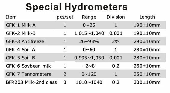 The hydrometers produced by our factory include densitometers, alcoholmeters, saccharometers, soil hydrometers, hydrometers for testing petroleum products, electrolyte hydrometers, tannometers, milk hydrometers, Baume hydrometers and urinoometers. In addition to those mentioned above, we also accept orders for hydrometers or special specifications. .