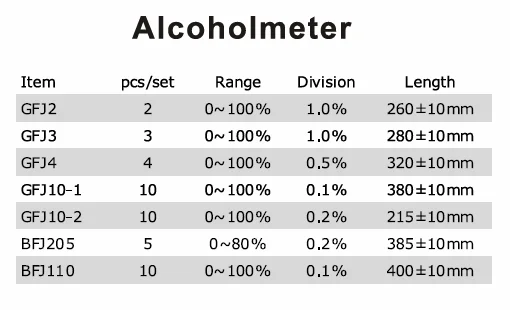 | 3 | 10 pcs alcoholmeters | 0-100 | 0.1 | 380±10mm | |||