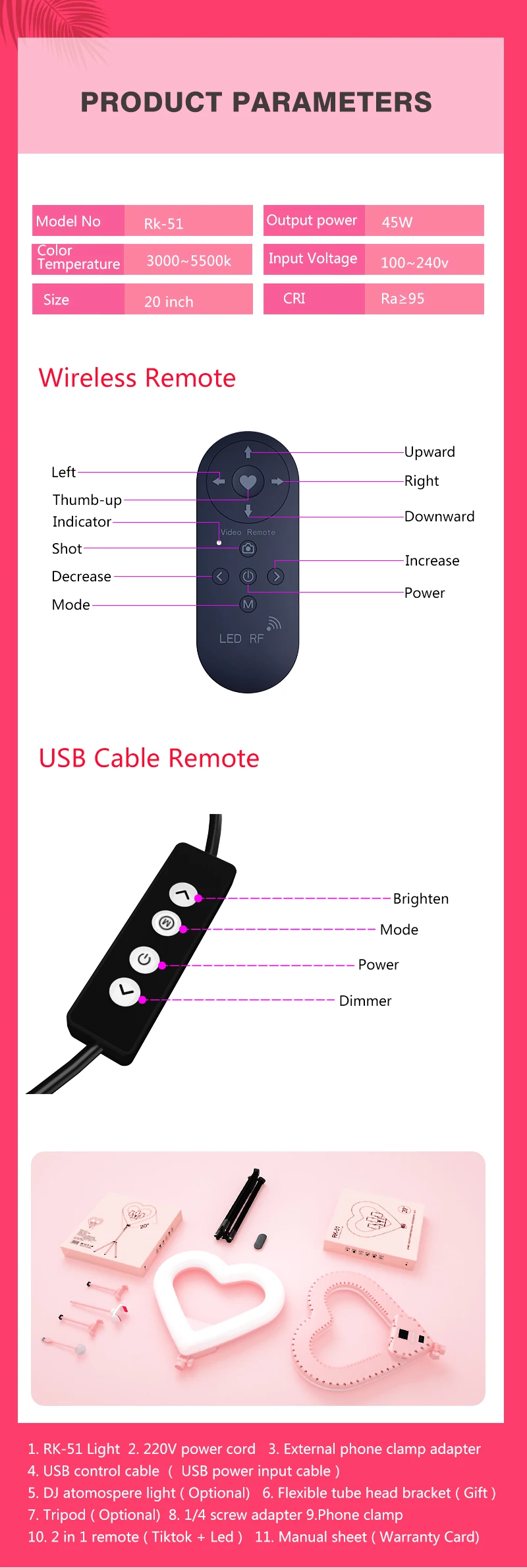 10 . 2 in 1 remote ( Tiktok + Led ) 11 Manual sheet ( Warranty Card )