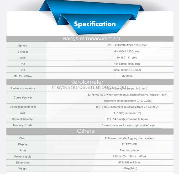 | Measurement Range: | Sphere: 0 ~ ±25D; | Size: | 474(L)*268(W)*472(H); |