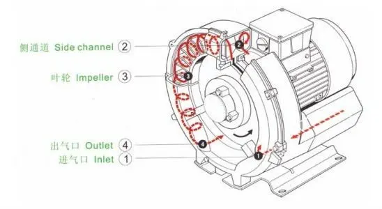 The gas it taken in through the inlet 1 .As it enters the side channel 2,the rotating impeller 3 imparts velocity to the gas in the direction of rotation.Centrifugal force in the impeller blades accelerates the gas outward and the pressure increase.Everyrotation adds kinetic energy.resulting in the further increase of the pressure along the side channel.The side channel narrow at the rotor,sweeping the gas off the impeller blades and dis-charging it through the outlet silencer 4 where it exits the side channel blower.