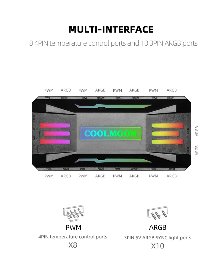 This is a multi-function controller, it not only supports automatic adjustment of fan speed through the motherboard CPU temperature, but also supports connecting the motherboard 5V 3PIN ARGB interface to control the lights through software. It also supports wireless remote control. It has 8 PWM ports and 10 ARGB ports, it looks cool and very practical.