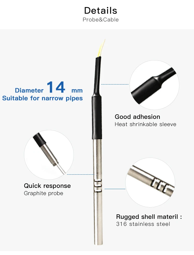 1.Sensor probe diameter only 14mm, It can be used for measurement of narrow pipe space.