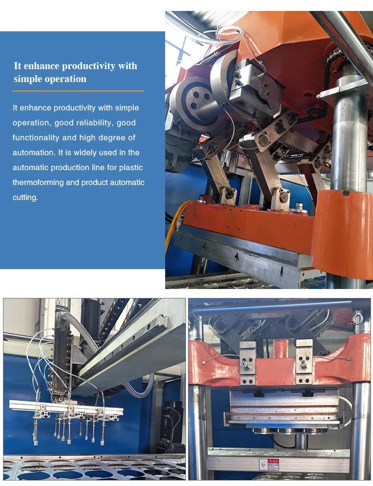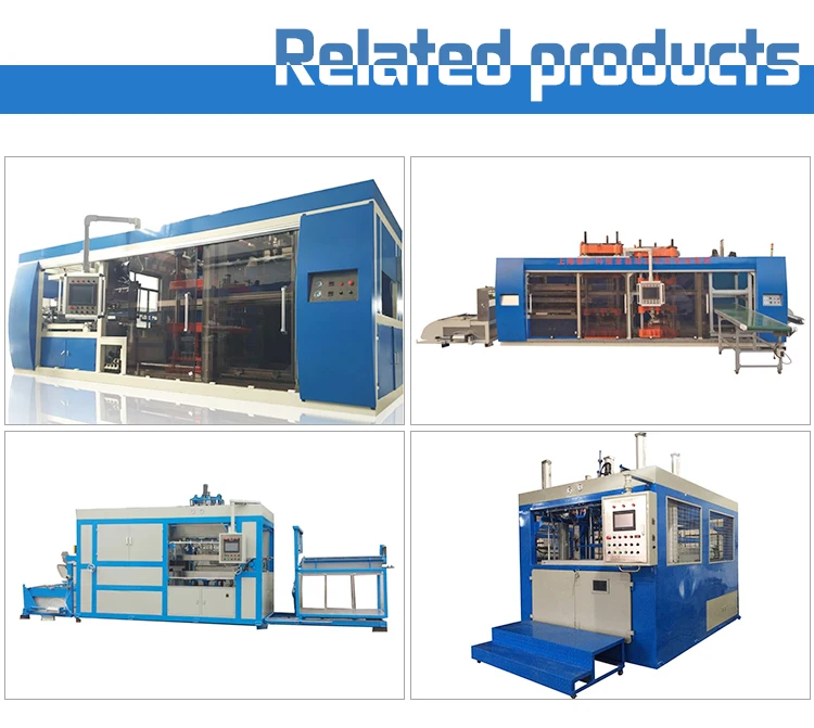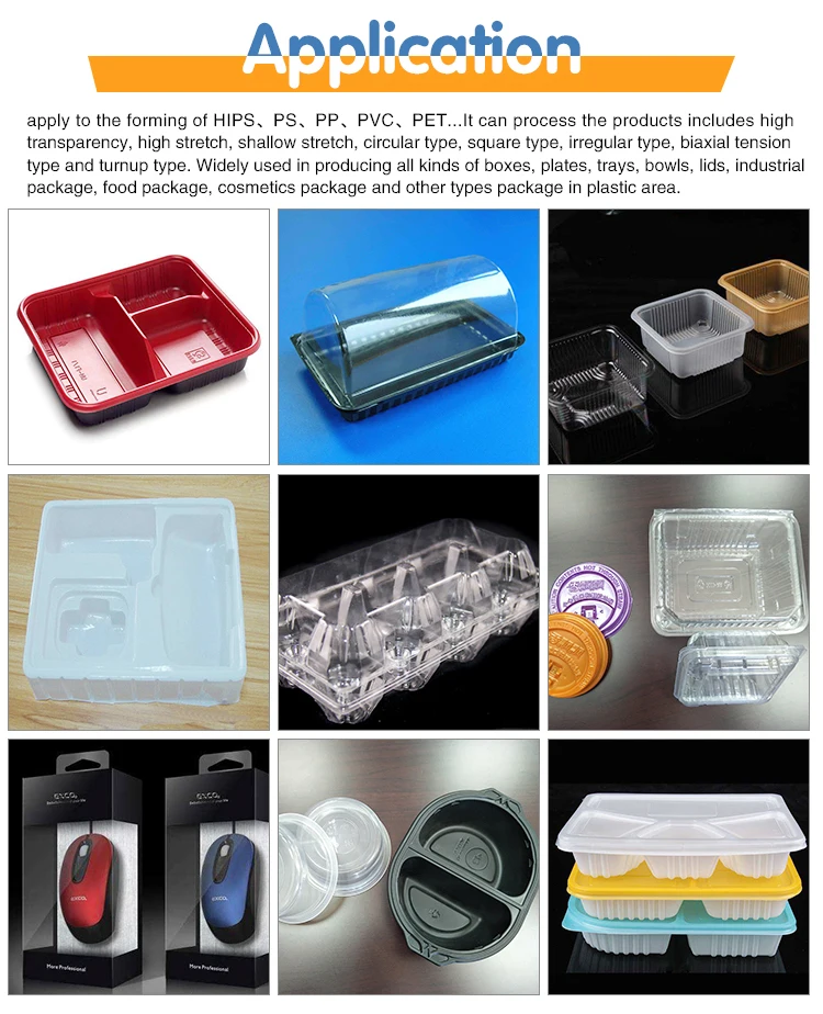 | Applications | Applicable to forming plastic sheet of HIPS, PS, PP, PVC, etc. It can process the products with high transparency, high stretch, shallow stretch, circular type, square type, irregular type, biaxial tension type and turnup type. It is widely used in producing all kinds of boxes, plates, trays, bowls, lids, industrial package, food package, cometics package and other types package in plastic area. |