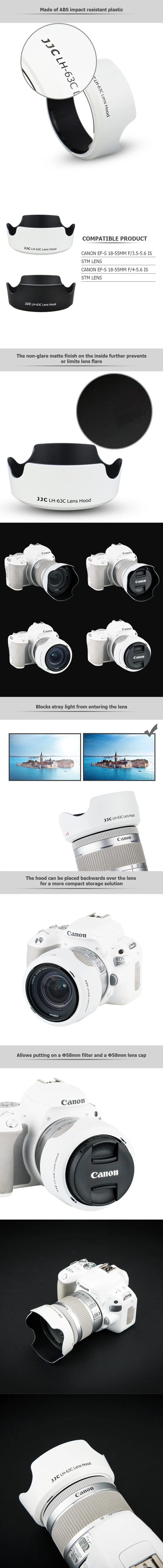JJC LH-63C Lens Hood is dedicated to Canon EF-S 18-55mm f/3.5-5.6 IS STM lens and helps to minimize flare by deflecting stray light from entering the lens. In addition, the "petal" shape of this lens hood maximizes the amount of hood coverage for the minimum amount of weight and hood area. There is no vignetting with the hood on. The hood allows you to put on filters and a lens cap. The hood can also be placed backwards over the lens for compact storage. The hood provides additional protection for the lens from accidental impacts, bumps, and scratches. The hood is available in black and white. JJC LH-63C Lens Hood replaces Canon EW-63C lens hood.