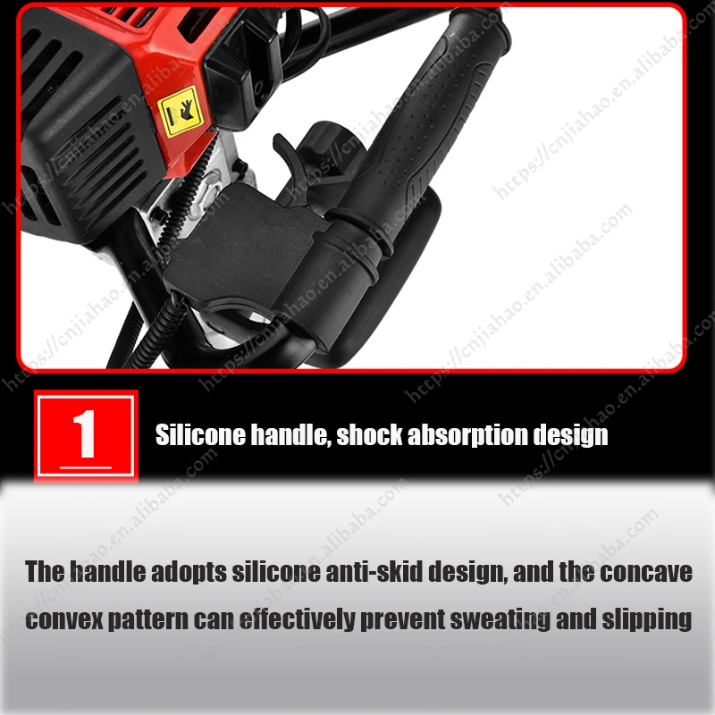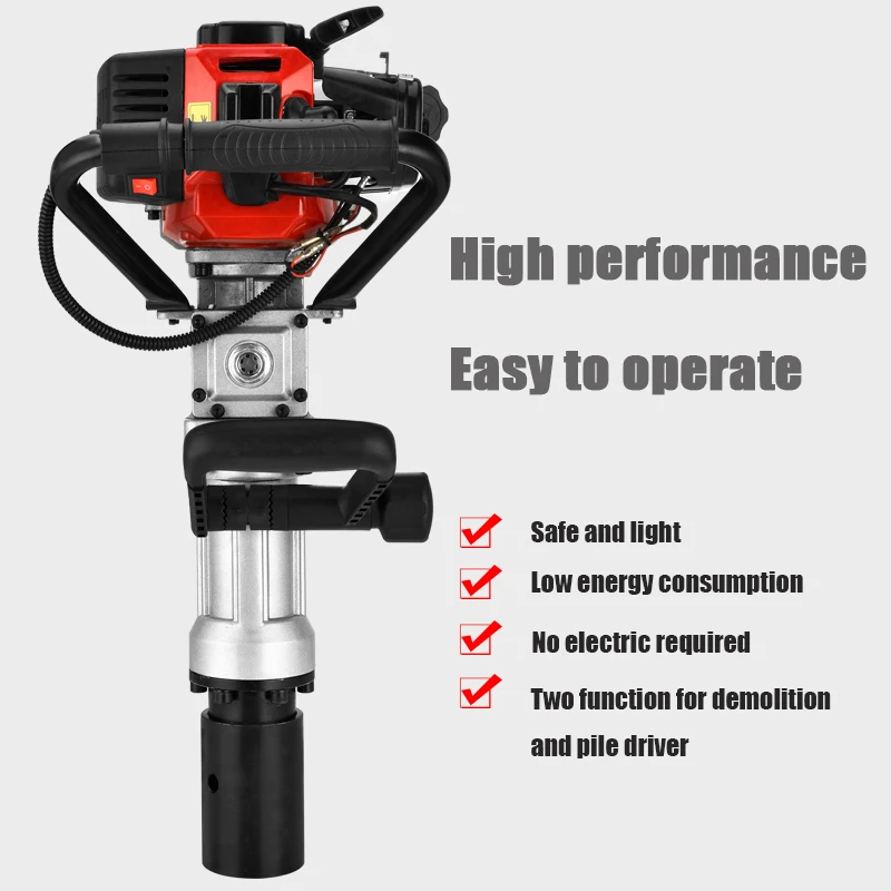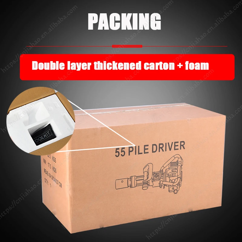 | Engine type: 36*32mm,single cylinder, air cooling, 2-stroke Fuel: oil mixture (gasoline:stoke engine oil:25:1) Fuel capacity:0.9L Displacement: 32.6cc Max. Power and speed:0.9kw/8500r/min Max. Torque and speed:1.45N.m/5300r/min Fuel consumotion rate:≤0.5L/h One function tool holder: SDS MAX One function tool holder: sleeve Impact frequency:1200-2200r/min Impact energy:20-45J Piling head size: 50 QTY/CTN: 1 Inner box: Foam box N.W:13kg (pile driver) 11.8kg(demolition hammer) Packing size: 64.5*34*37CM |